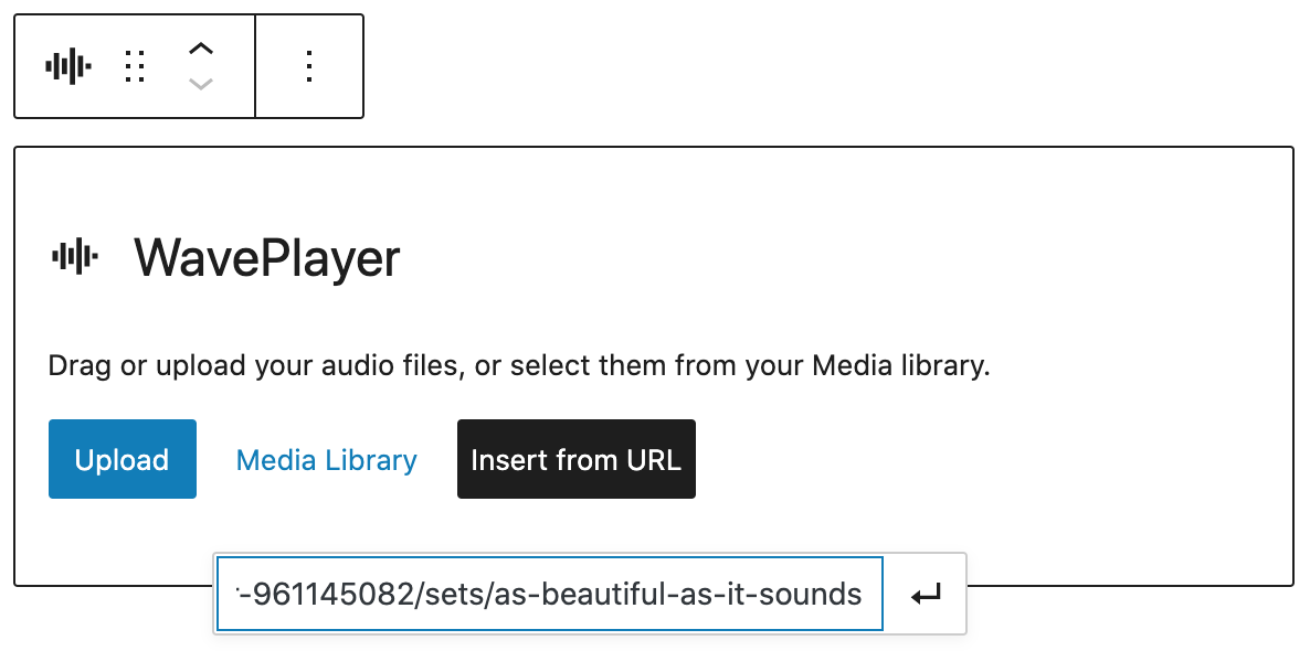 …and paste it in the URL field of the WavePlayer instance you are creating (in the following picture you can see a Gutenberg Block but this method is valid for an Elementor widget, as well as the Classic Editor and the regular WavePlayer shortcode).