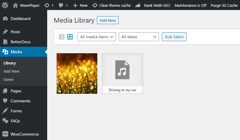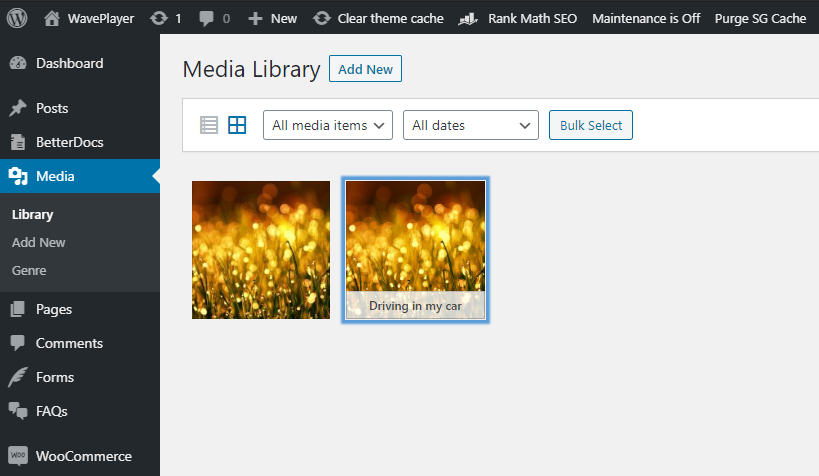 - Go to your Media Library and upload both the audio attachment and the image you want to use as its thumbnail.