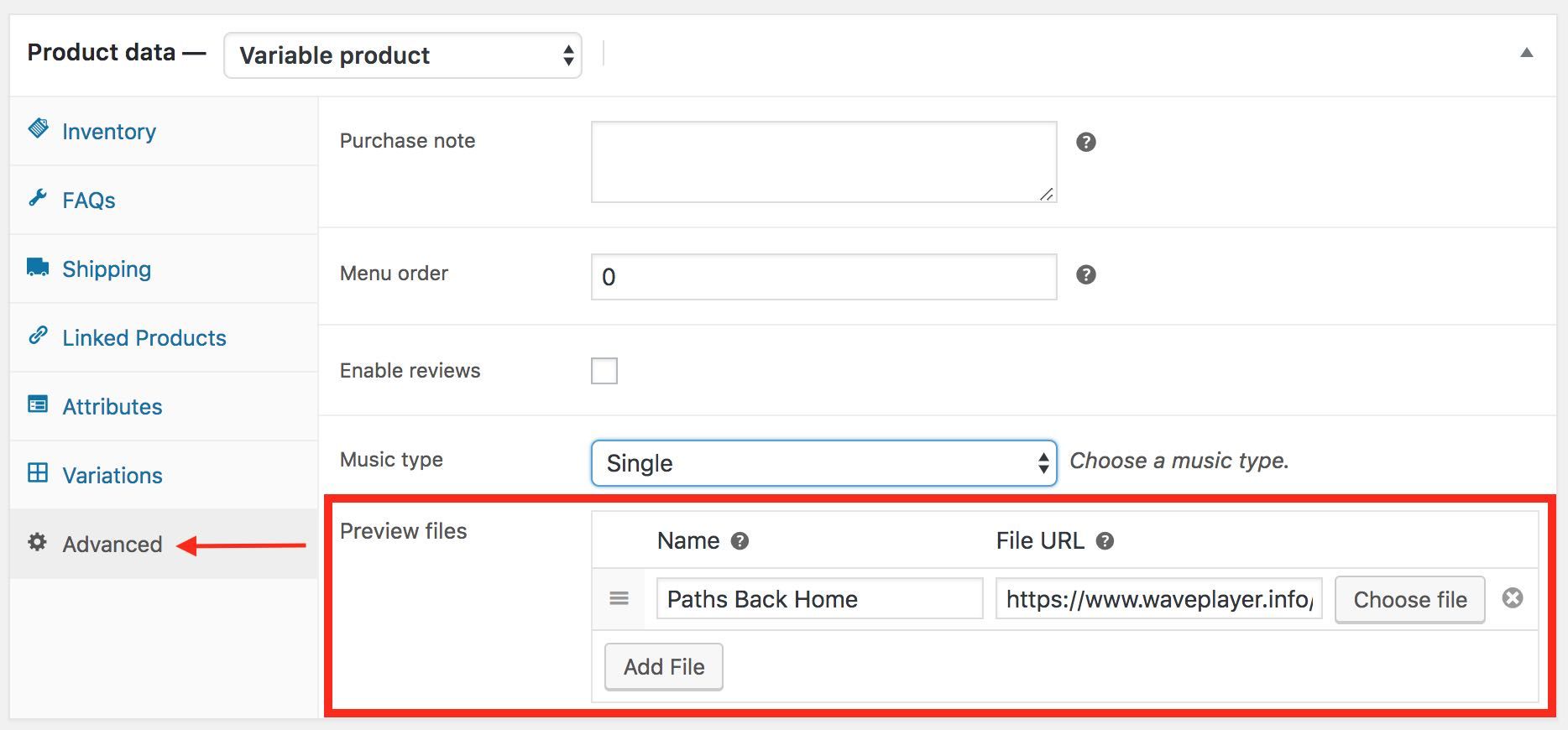 That is why WavePlayer adds a Preview File section to the Advanced tab of the WooCommerce product editor. When you add one or more preview files to a WooCommerce product, WavePlayer will automatically insert into the product page and the product list item of the Shop page an instance of the player containing those preview files.