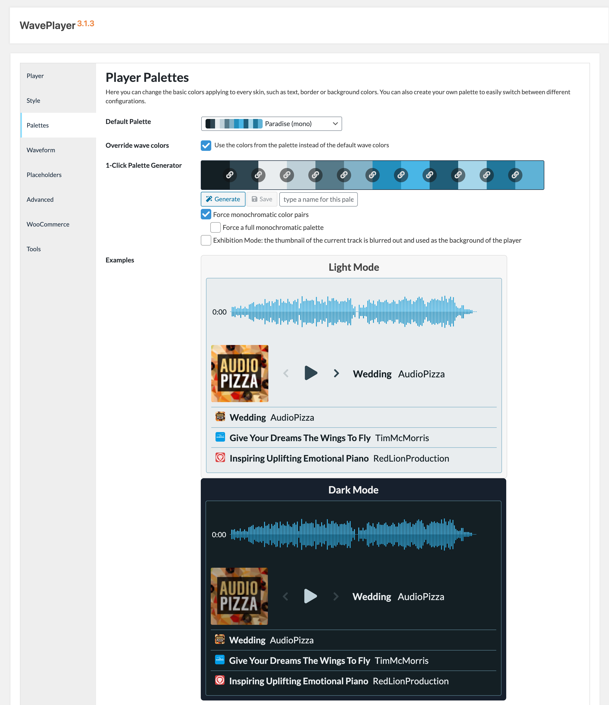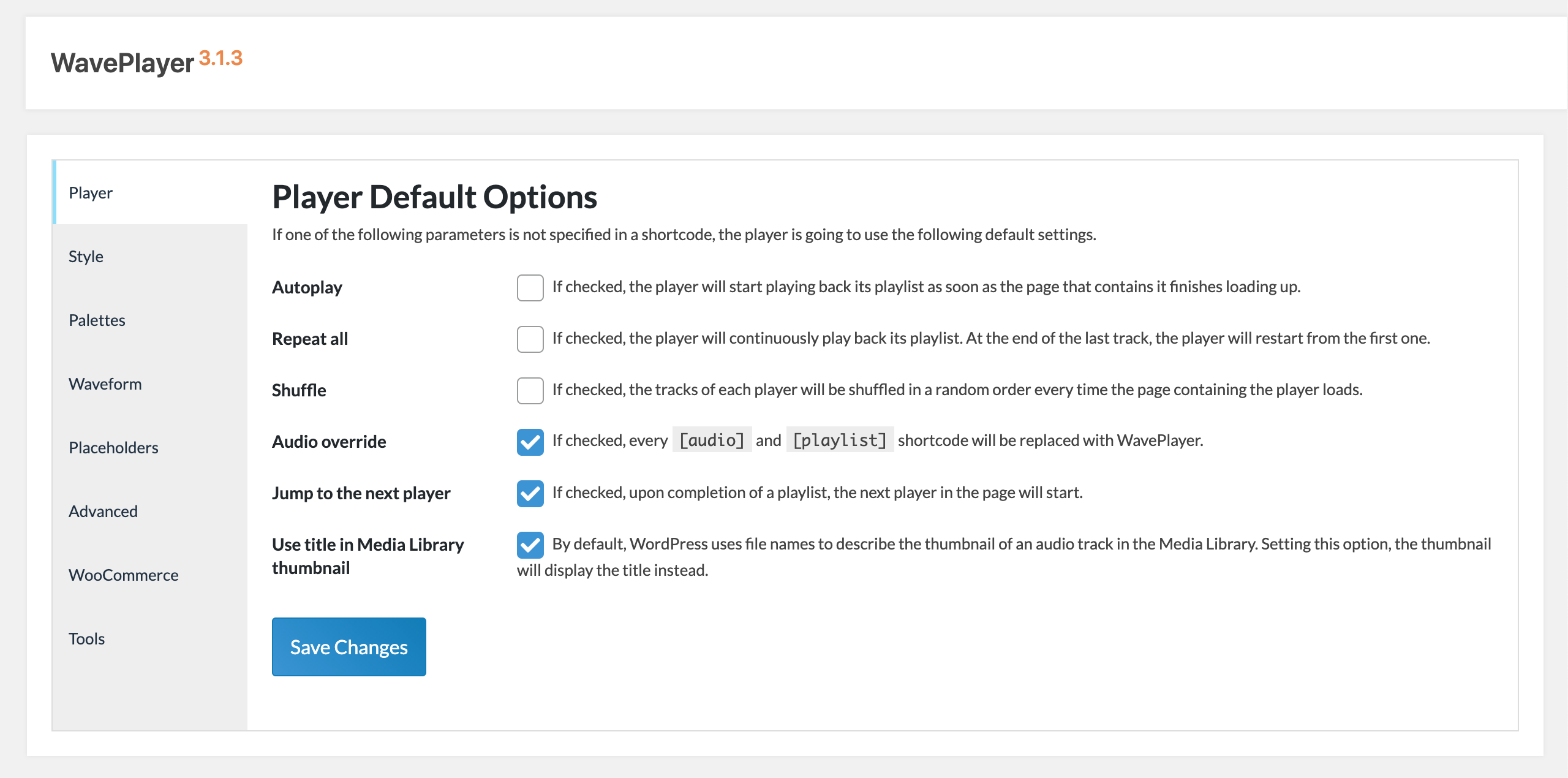 In this panel you can also choose whether the WavePlayer will override the default audio and playlist shortcodes and if the playback will automatically jump for an instance to the following one at the end of each playlist.