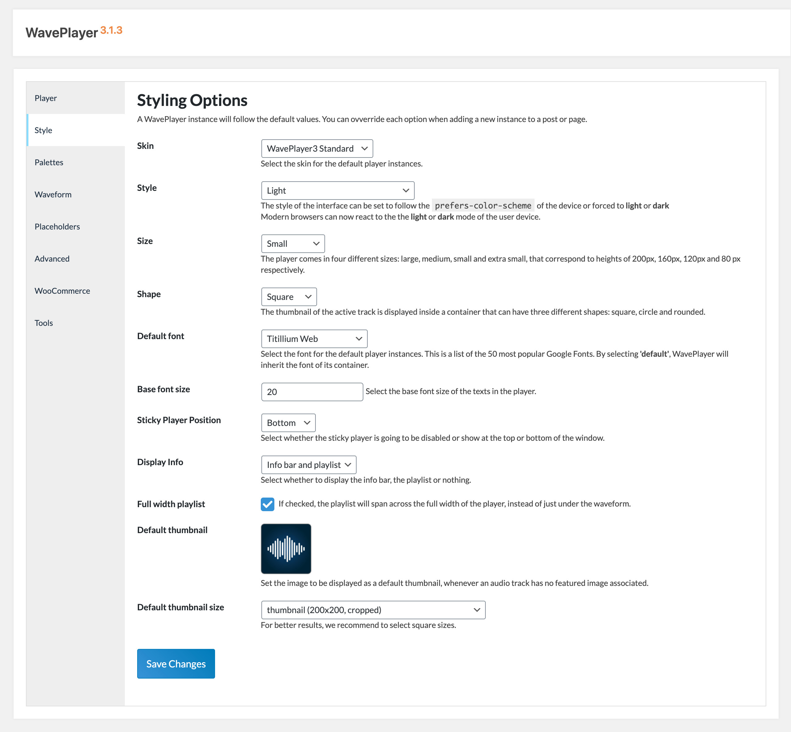 In this section, you can select the default skin, style, size and shape. You can also choose the default font used for text elements of the player, the position of the sticky player and the default thumbnail used by the player when the track currently playing back is not associated to any featured image.