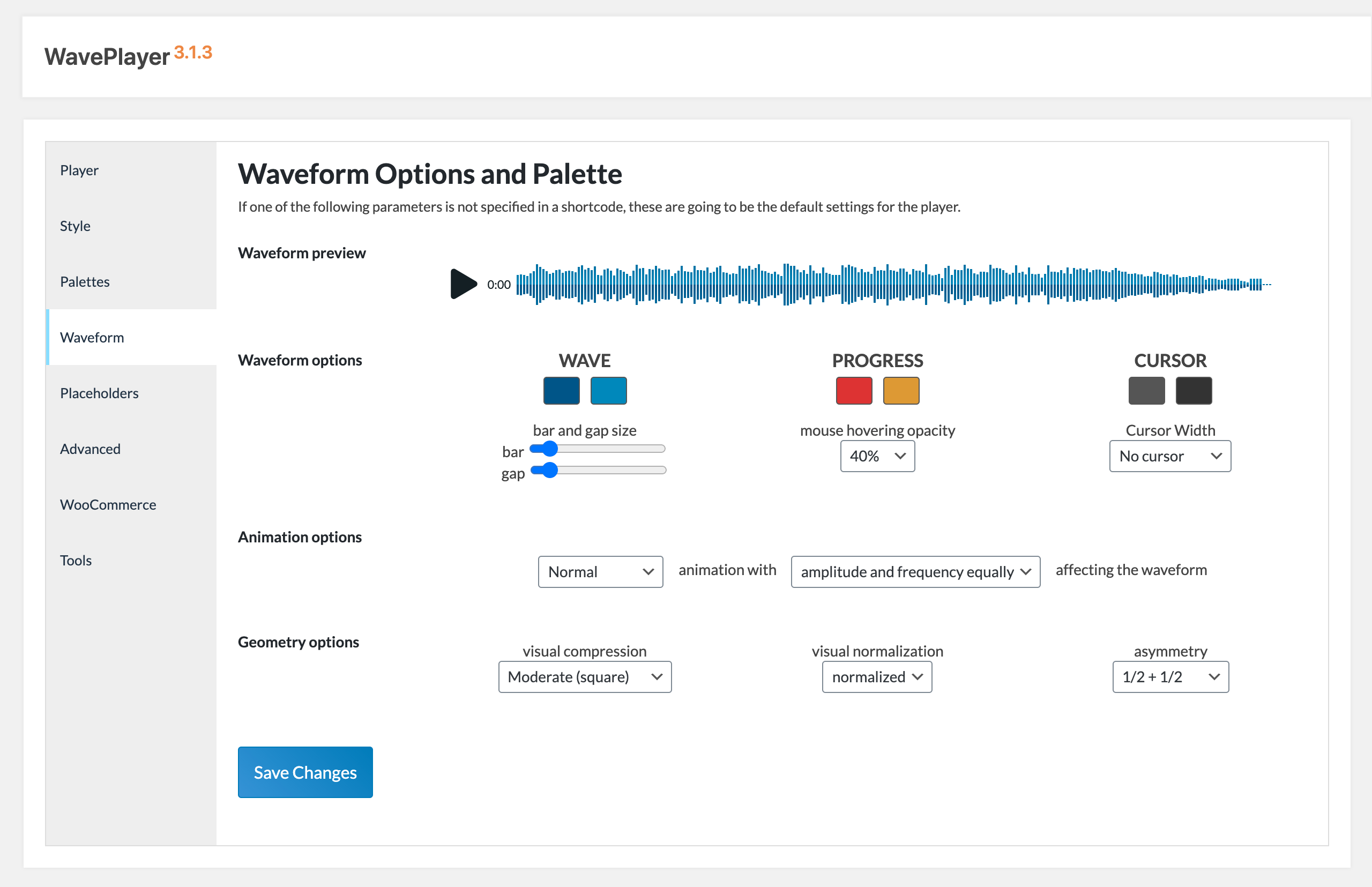WavePlayer settings – located at the Settings –> WavePlayer page of the WordPress Admin area – define how to display a shortcode with no parameters provided other than the IDs of the audio tracks you want to included in that particular instance of the player, like the following one: