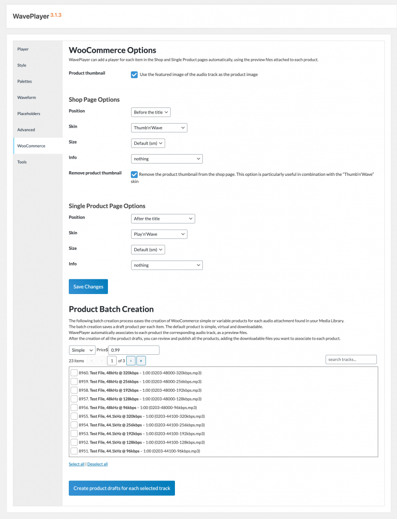 In the top one, you can select all the options regarding how WavePlayer will incorporate an instance of the player to your products, in both the Shop and Product pages.